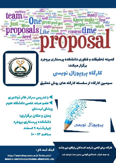 کارگاه    پرپوزال نویسی روز چهارشنبه 9/ 12/ 1402 ساعت 10 الی 12 به صورت حضوری و با تدریس سرکار خانم ذوالنوری، توسط کمیته تحقیقات و فناوری دانشجویی دانشکده پرستاری بروجرد برگزار گردید